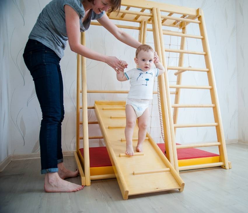 - шведская стенка крепится стационарно к вертикальной поверхности, предназначена для лазания и гимнастики. Подобный элемент подойдет детям от 1 года, но, естественно, в упрощенном варианте с частыми перекладинами небольшого диаметра. Для детей от 4 лет можно брать универсальную шведскую стенку, а по мере взросления маленького человека – дополнять ее новыми элементами;