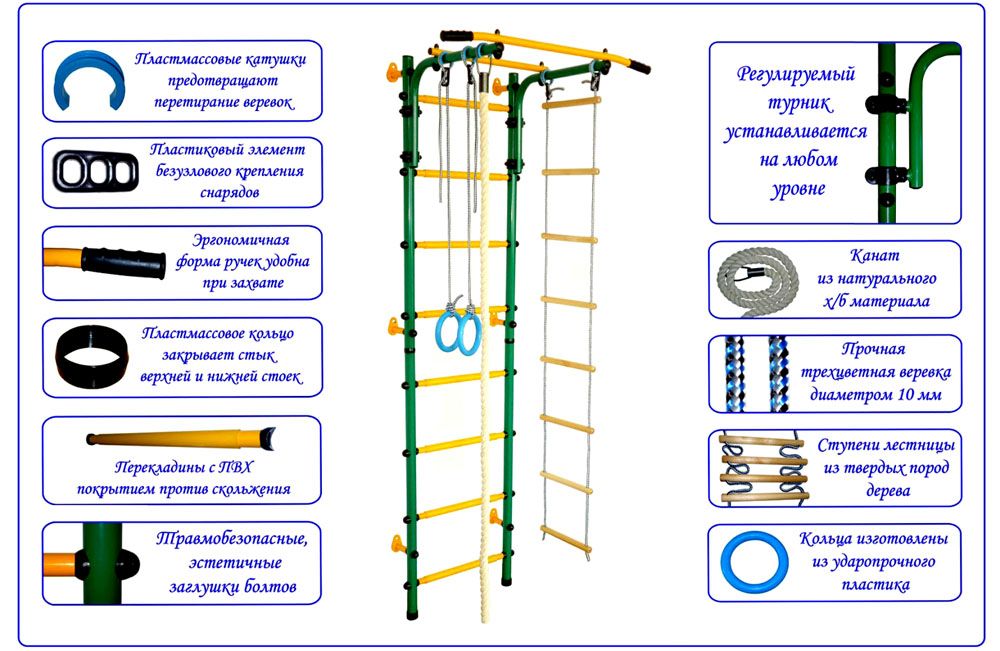 Также надо обращать внимание на мягкие и противоскользящие элементы, которые могут размещаться на перекладинах, дополнительных снарядах (брусьях, кольцах и пр.). Учитывается возможность установки дополнительной оснастки, качество обработки деревянных деталей. Классический вариант крепится к стене путем засверливания, установки распорных дюбелей, анкеров
