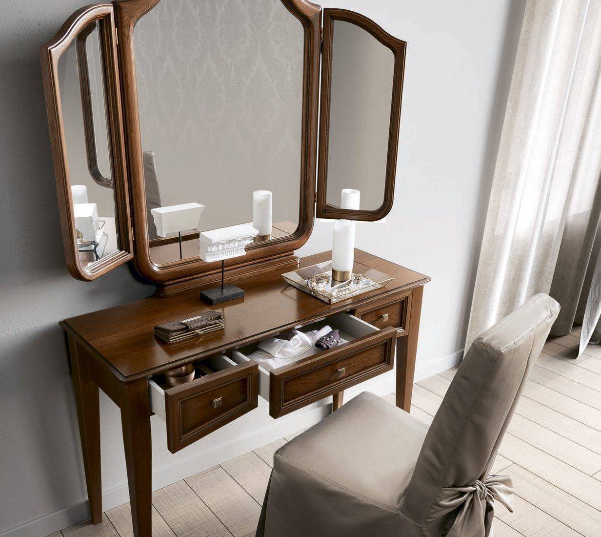 Классический туалетный столик – представляет собой обычный стол с четырьмя ножками, приставленный к стене, на которой располагается зеркало. Может иметь выдвижной ящик.