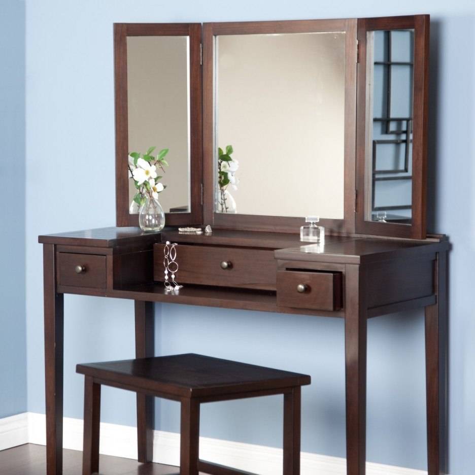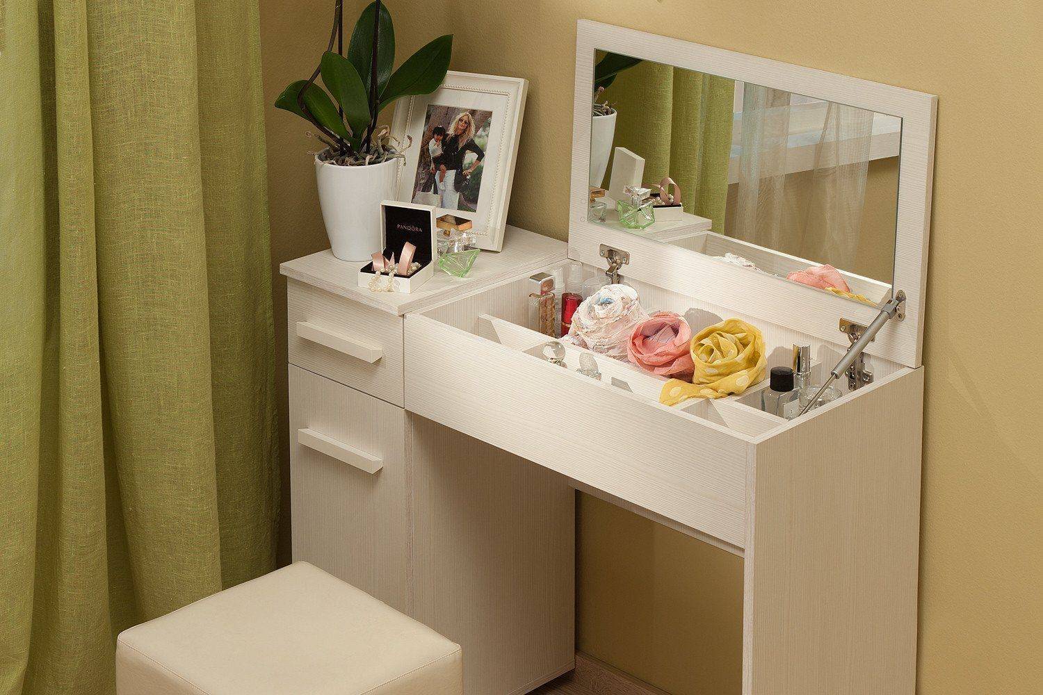 Если наличие зеркала и освещение не играет большой роли, можно выбрать туалетный столик без зеркала или с откидным зеркальным полотном. Большую площадь он не займет и будет идеальным решением для хранения туалетных принадлежностей.
