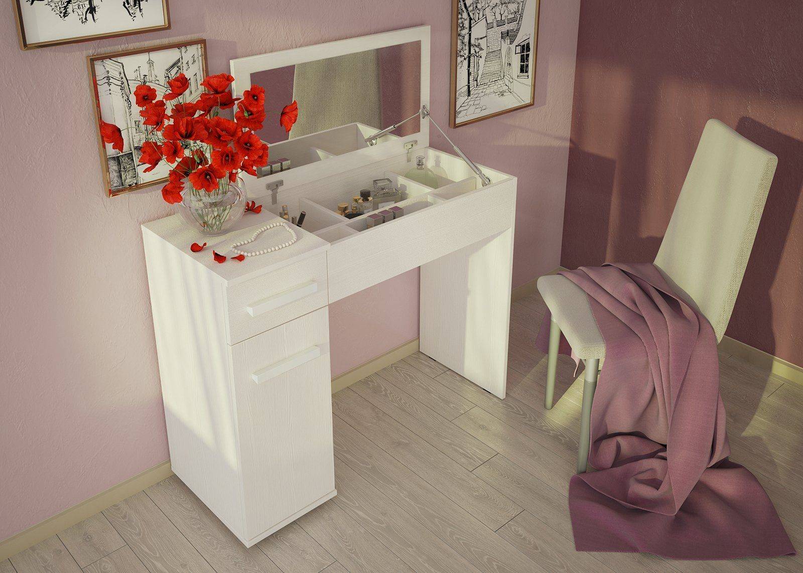 За прекрасным столиком с зеркалом девушкам очень нравится любоваться собой, делать макияж и прически. Помимо зеркала и удобной столешницы, в столике имеются специальные полочки, и ящики для хранения необходимого инвентаря и различных вещичек.