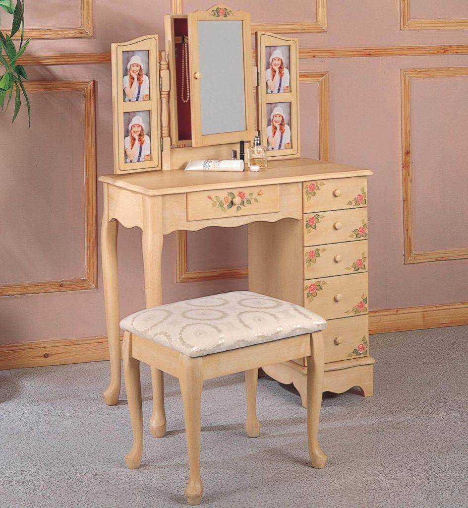 В лаконичный интерьер комнаты для подростка удачно впишется столик с плавными линиями, оригинальными формами и большим количеством ящиков для хранения косметики, бижутерии и других необходимых предметов. Винтажный стиль украсит изделие из дерева, выполненное с применением эффекта состаривания. Такой столик имеет пастельные оттенки, пуф с юбкой и дизайн с цветочными узорами.