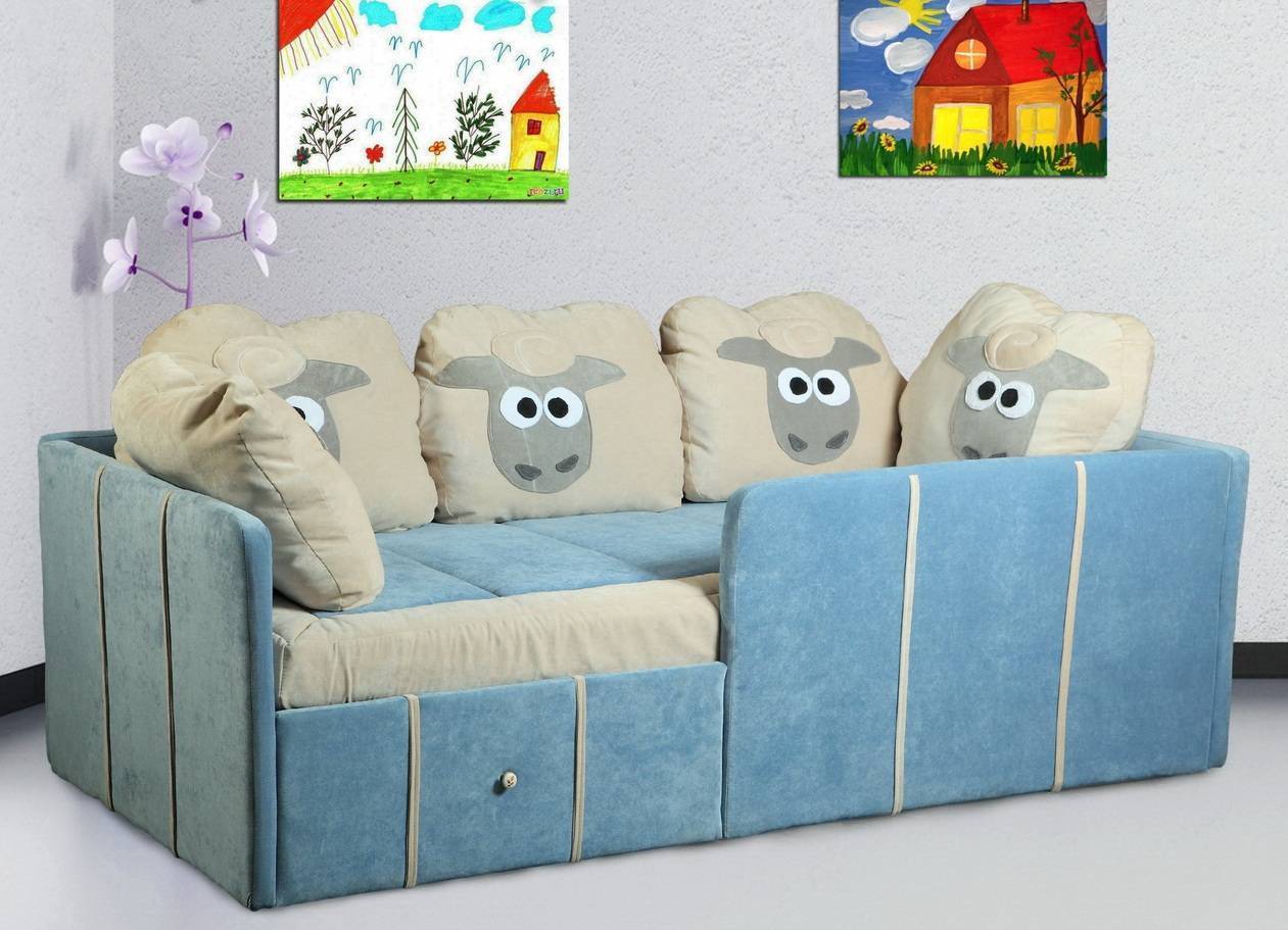 Когда обитатели детской — обоих полов, желательно выбирать анималистические мотивы и другие универсальные сюжеты. При подборе дивана, оборудованного выдвигающимися отсеками для хранения, надо уточнять, оснащены ли они средствами для защиты пальцев. Достаточную безопасность обеспечивают мягкие подлокотники