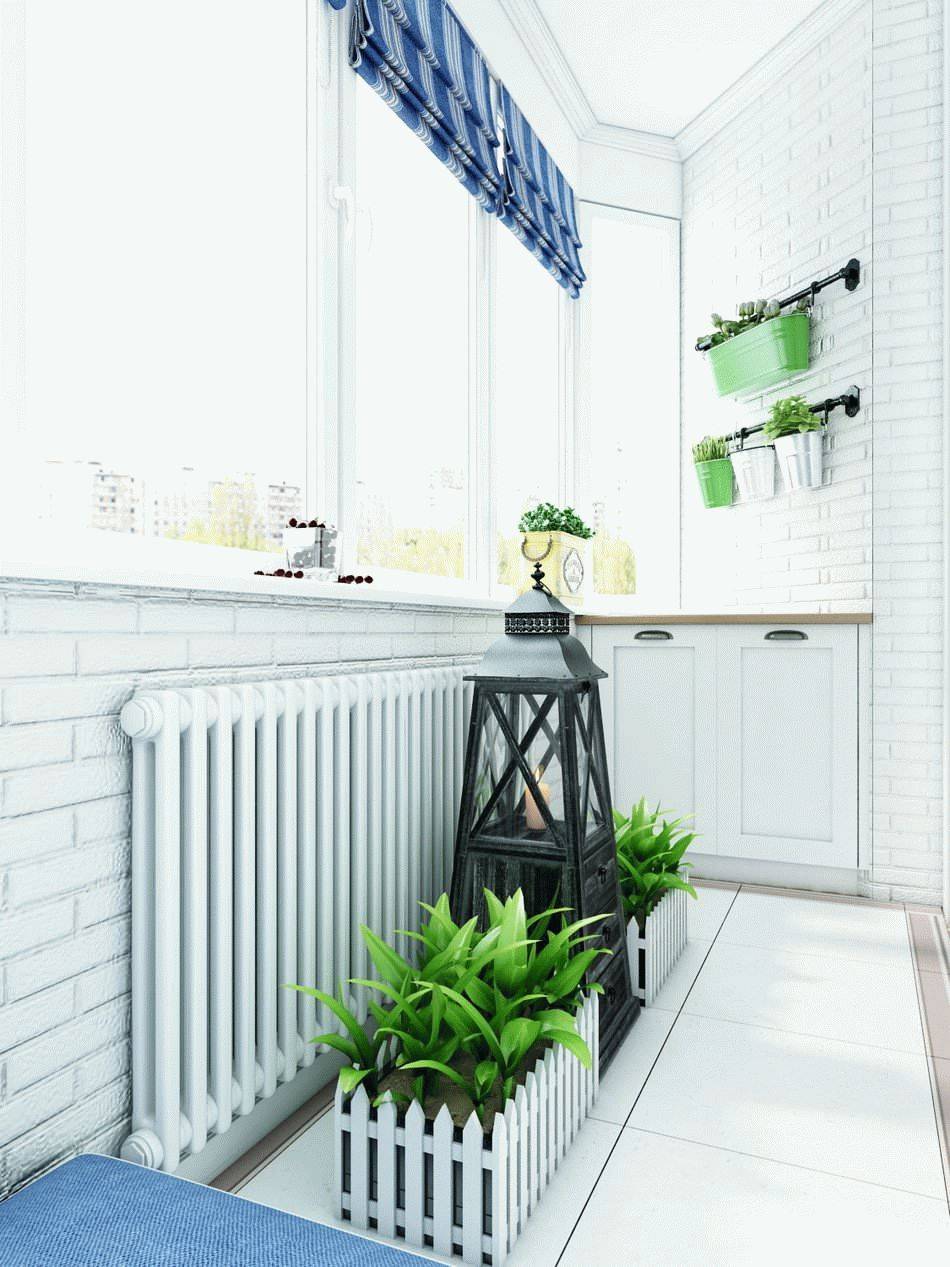 Декор в стиле прованс предполагает наличие мягких природных натуральных цветов в оформлении и категорически отрицает яркие контрастные тона. Для оформления «прованского» балкона можно отдать предпочтение белому цвету, а также его вариантам в виде сильно выгоревших или выцветших других цветов. Кроме того, хорошо подойдет цвет морской волны, лаванды, охры, терракотовый, мягкие оттенки зеленого цвета – оливковый или фисташковый.