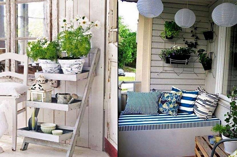 Особое место на балконе в стиле прованс займет деревянный или кованый столик, удобное изящное кресло (возможно, кресло-качалка), небольшой комод, кованые подставки для цветов. На балконе можно расположить уютный диван с обивкой изо льна или хлопка, а также со множеством подушек из той же ткани. Обивку можно выбрать в полоску или с изображением цветов.