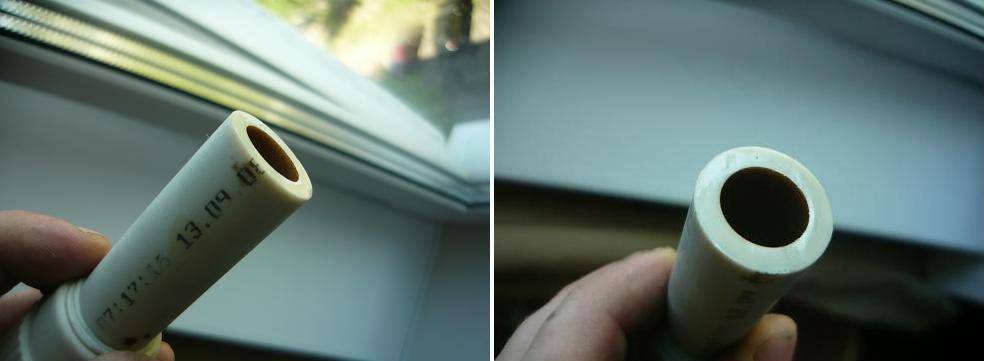 установки счетчиков. На срезе не видно изменений в толще полипропилена, на внутренних стенках налет кофейного цвета,