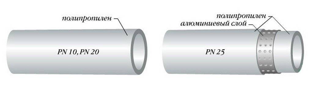 PN25. Это изделие имеет принципиальное отличие от предыдущих типов, поскольку армировано фольгой из алюминия или стекловолокном. По свойствам армированная труба схожа с продуктами из металлопластика, менее подвержена температурному воздействию, выдерживает 95 градусов. Предназначена для использования в системах отопления, а также в ГВС.