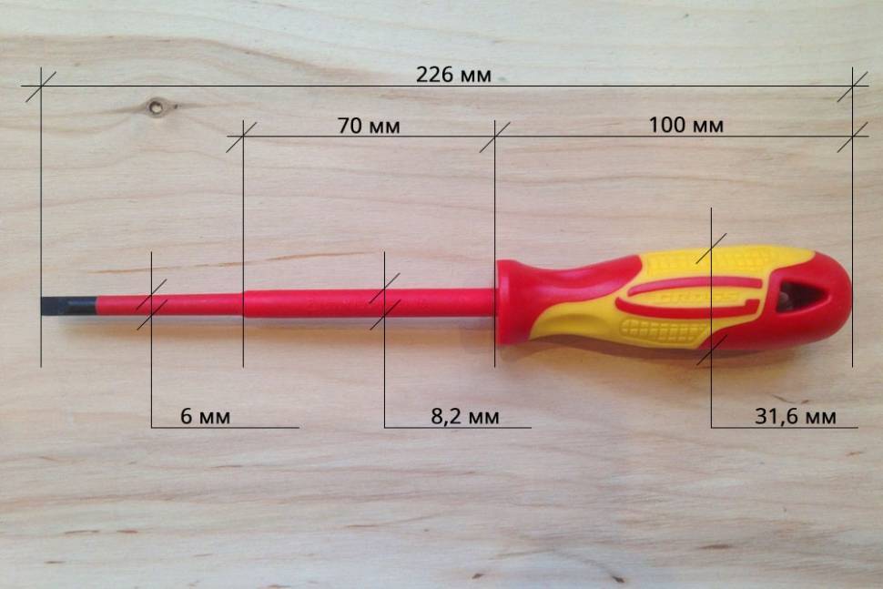 Шлицевая отвёртка, наоборот, длиннее — 226 мм , но тоньше — 32 мм в самой толстой части рукоятки.