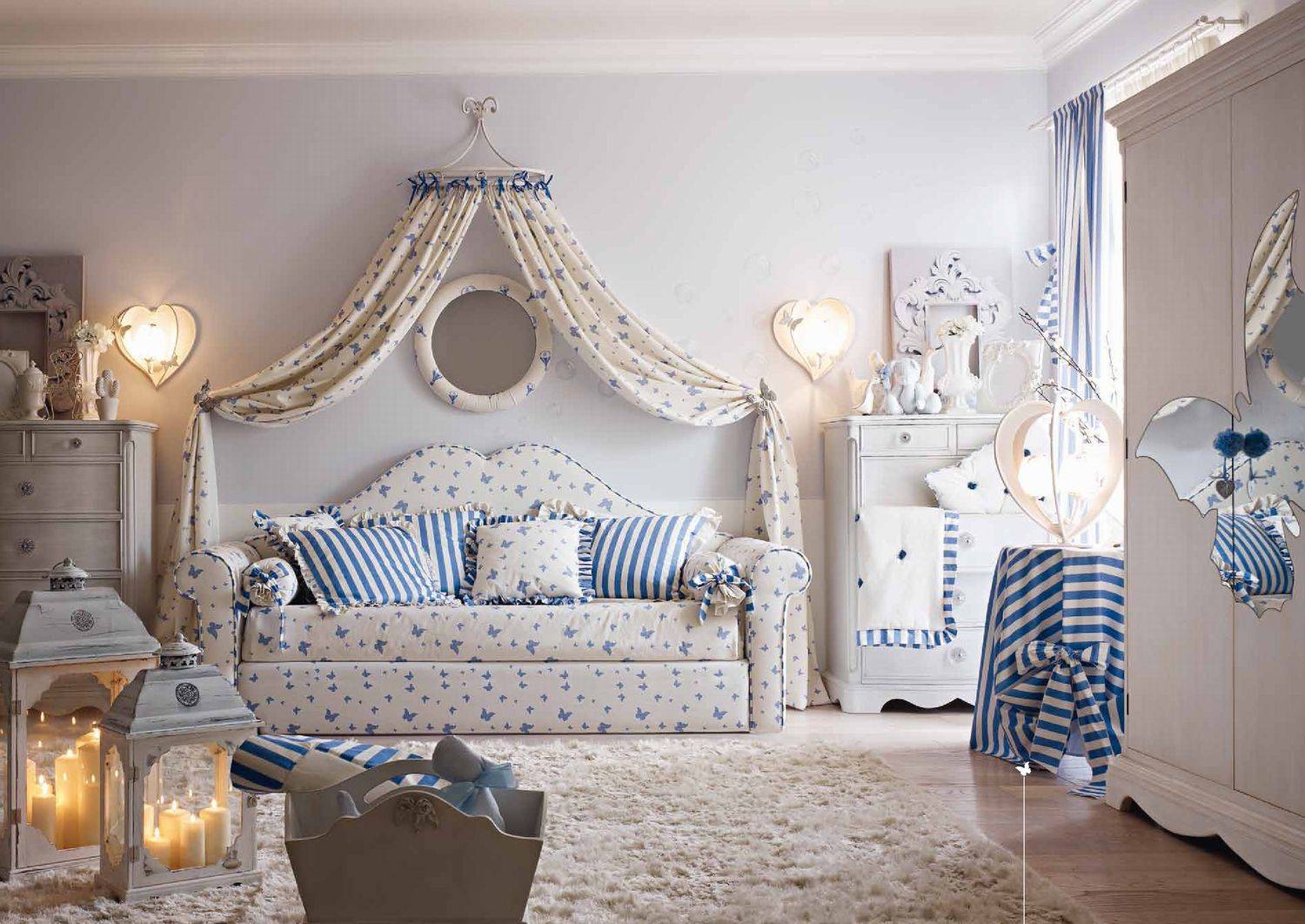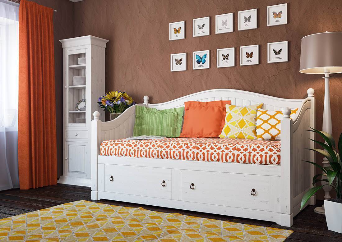 - Романтичные натуры выберут неяркие пастельные тона (светло-лавандовый, песочный, оливковый). Стиль Прованс более всего соответствует спокойным и мечтательным девочкам, и такую кровать-диван лучше выбрать с подлокотниками. Для обивки подойдет как однотонный текстиль, так и с мелким узором. Стоит присмотреться к тканям хлопковым, льняным. В комплект к дивану желательно заказать несколько небольших декоративных подушек. Эти элементы привнесут в комнату домашнее настроение и уют;