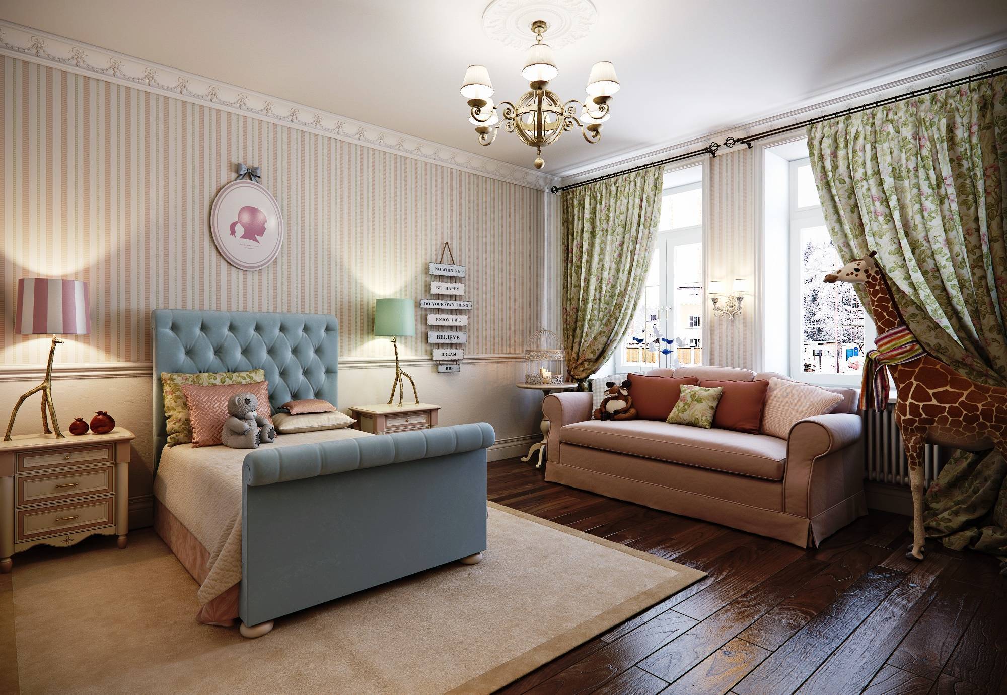 - Поклонницам комфортных интерьеров с нотками роскоши подойдет классический стиль. Характерные черты дизайна: сочетание однотонных поверхностей и узорчатых, мебель из натуральной древесины. Основная цветовая гамма: оттенки голубого, желтого, розового или зеленого цветов. Оптимальный вариант – кровать-диван с подлокотниками, обитый гобеленом, велюром, узорчатым плотным хлопком;
