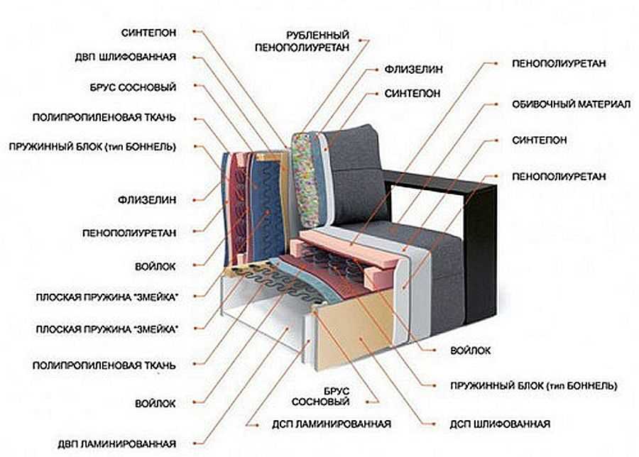Какие слои должны быть в сидении дивана - Основание под пружинный блок. Тут могут быть варианты: ламели (планки упругого материала), a href=”https://kak-sdelano.ru/stroitelnyie-i-otdelochnyie-materialyi/dvp”>ДВП, a href=”https://kak-sdelano.ru/stroitelnyie-i-otdelochnyie-materialyi/fanera”>фанера. Самый бюджетный вариант — ДВП, самый дорогой — ламели. Ламели крепятся на специальные упоры (латодержатели). При использовании пластиковых упоров, есть вероятность их поломки. При этом некачественные ламели могут прогнуться (в нормальном состоянии они выгнуты немного вверх) или сломаться — для снижения стоимости их зачастую располагают через большой промежуток. Все это приводят к тому, что сиденье дивана продавливается. Вместо деревянных ламелей еще могут стоять пружины-змейки. Они также имеют достаточную эластичность, но стоят меньше. Проблемы с ними такие же.