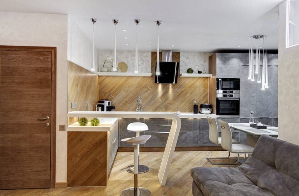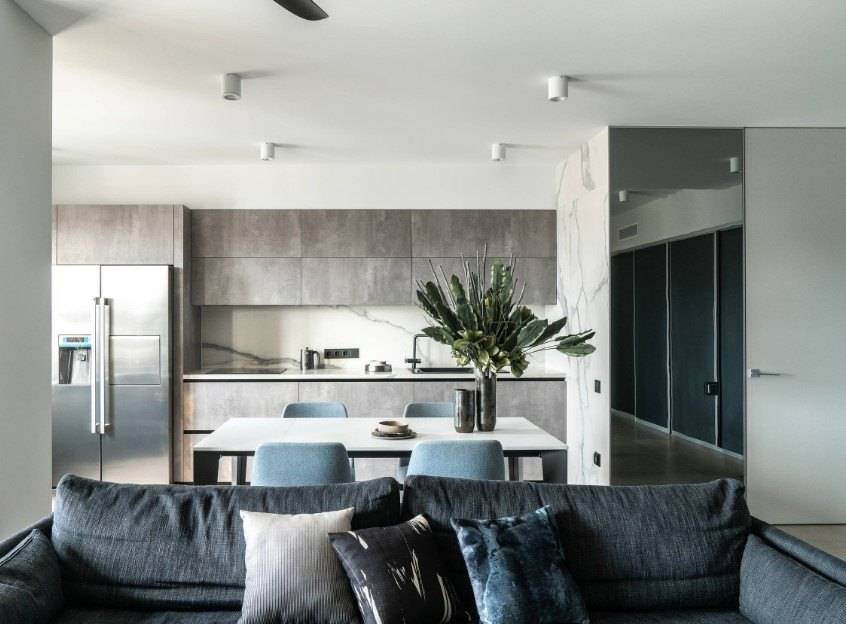 Не смотря на все «против» в 2021 году, проектировщики продолжают совмещать между собой кухонную зону и гостиное пространство, одновременно разделяя их раздвижными панелями и оригинальными перегородками, которые чётко определяют границы. Такая реконструкция позволяют заниматься приготовлением еды, не прерывая общения с гостями или остальными членами семьи, что, по мнению психологов, делает общение более близким.