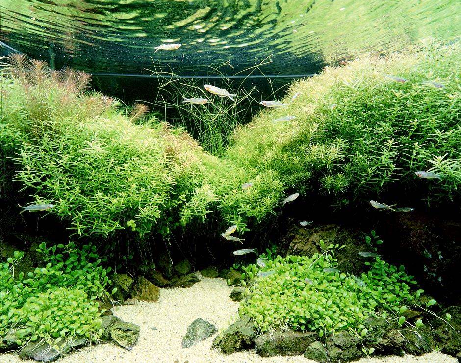 Для высадки используются светло- и темнозеленые, бурые, желтоватые и красные водоросли. В среднем на каждое растение приходится 10 см2 дна – это плотная посадка, но она оставляет растениям возможность хорошо развиваться и формировать в аквариуме тот обильный зеленый ландшафт, которым знамениты Нидерланды. А проплывающие небольшие, но яркие рыбки, придают ему остроту сюрреализма.