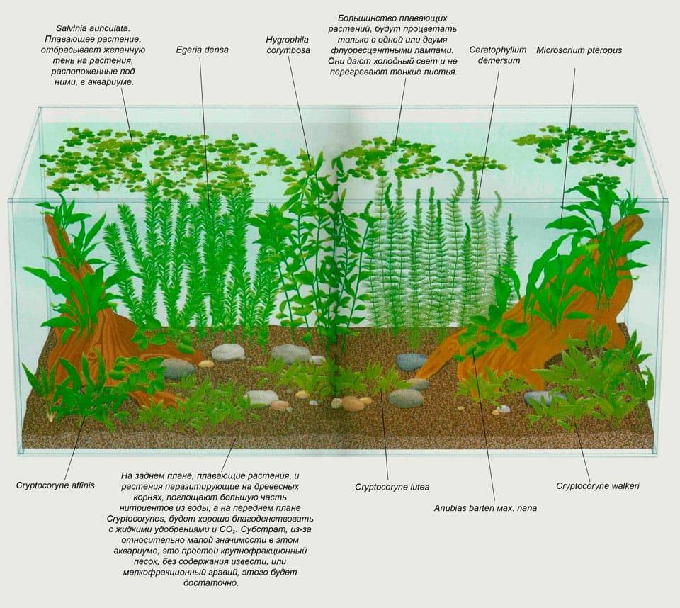 Оформление аквариумов растениями — это важная часть акваскейпинга. Они служат для рыб укрытием и питанием, также выделяют кислород. Растительность выбирается полностью безопасная для рыб. Следует избегать появления на растениях в аквариуме водорослей — это вредит здоровью рыб.