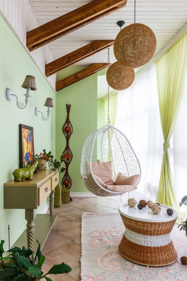 Если такой вариант покажется вам слишком скучным, то балконную часть помещения можно оформить в яркие и контрастные цвета, но они обязательно должны перекликаться с оттенком основного помещения.