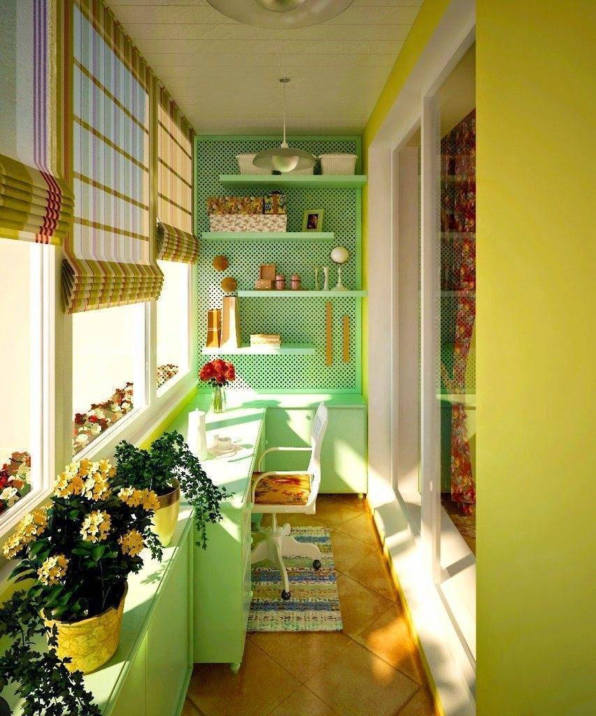- Не загромождайте небольшое балконное пространство крупными предметами мебели. Замените закрытые шкафы открытыми полочками, обеденную группу – компактным складным столом и легкими стульями.