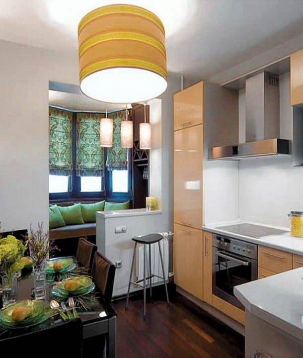 Если же вам посчастливилось объединить две зоны, демонтировав перегородку, можно для классического дизайна оформить ее бока колоннами, а если в современном, то соорудить ступенчатый потолок (двухуровневый) любого дизайна и формы с помощью гипсокартона и оригинальной подсветки.