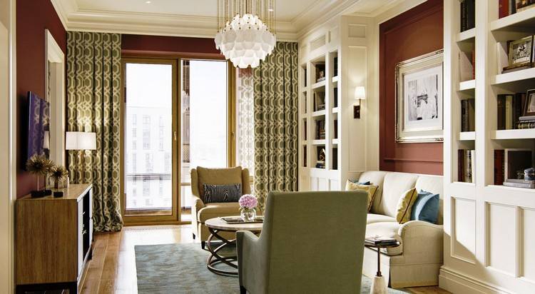 Если вы оставляете проем между зонами без изменений с окном и дверью, то в качестве декора обязательным будет наличие штор. Для этого используются разнообразные решения, исходя из требований гостиного интерьера: рулонные, римские, классические. Если вы используете современный вариант штор, не классику, то идеальное решение, если полотнища будут достигать длины на дверях до пола, а на окне – до подоконника.