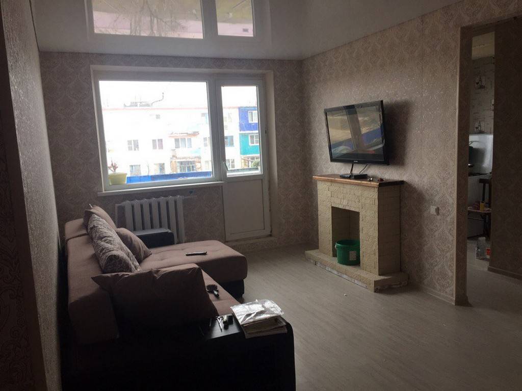 На фото зона отдыха в квартире хрущевке, выделенная узорчатыми обоями серого цвета.