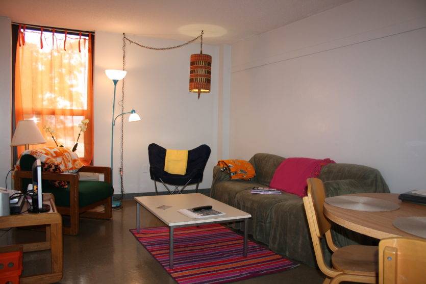 Владельцы этой хрущевки тоже отказались от декора. Надо признать и тот факт, что в таком дизайне важную роль начинает играть и вид за окном, поскольку в комнату врывается вид потрепанных домов по соседству.