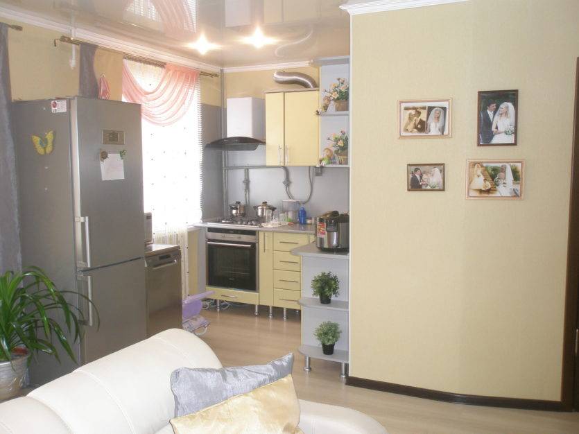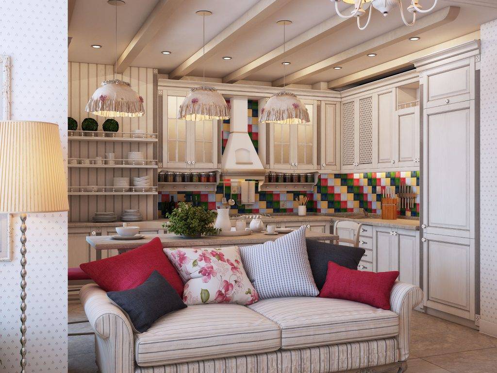 При желании соединить кухню и гостиную, желательно выбрать для одной из комнат индивидуальный цвет отделки и отличный материал при создании декора. В качестве подходящих оттенков могут рассматриваться тёплые тона – молочные, белоснежные, голубые.