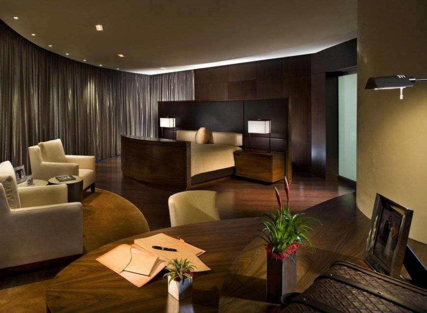 Выделить участок для отдыха очень просто – на его площади устанавливают кровать. Если спальня с темной мебелью, то стены и портьеры могут быть на пару тонов светлее. Для солидных интерьеров часто подбирают мебель, покрытую лаком.
