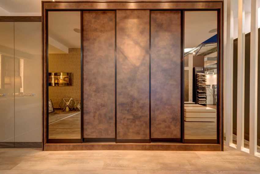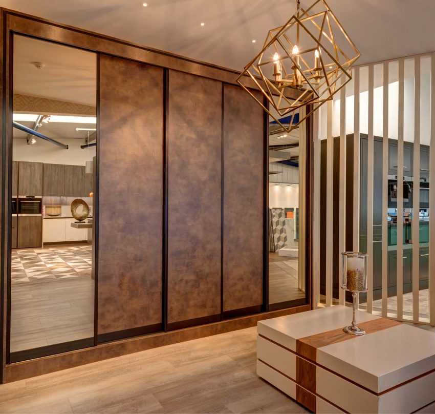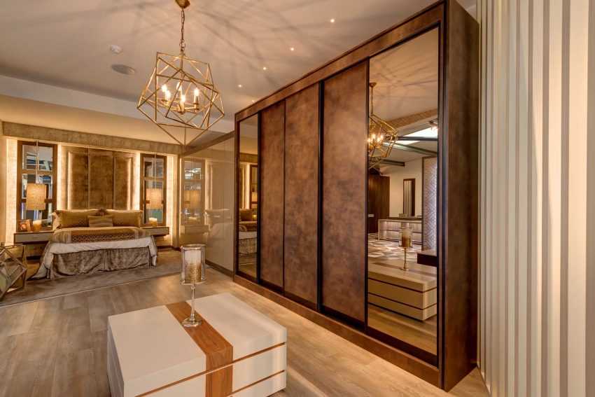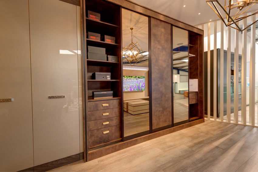 Слишком яркое искусственное освещение не применяют, чтобы не уставали глаза. Шкафы размещают вдоль стен. Последние модные тенденции – шкафы-купе с двойными дверями, где скрыты зеркала во весь рост.