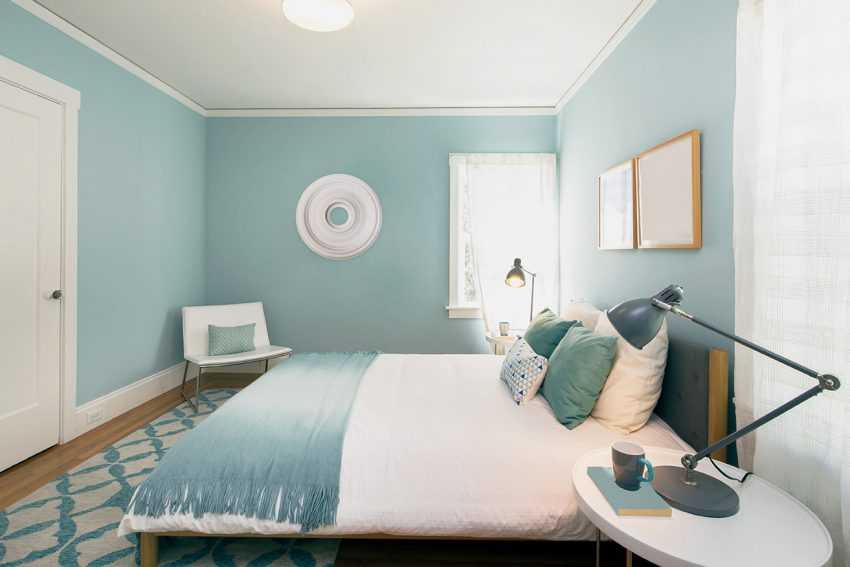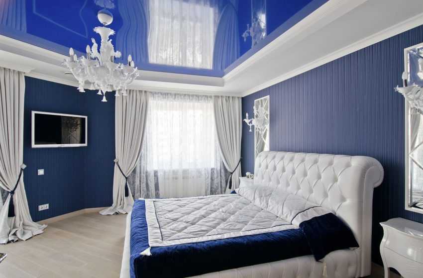синяя спальня лучше всего будет смотреться со светлым полом и потолком.