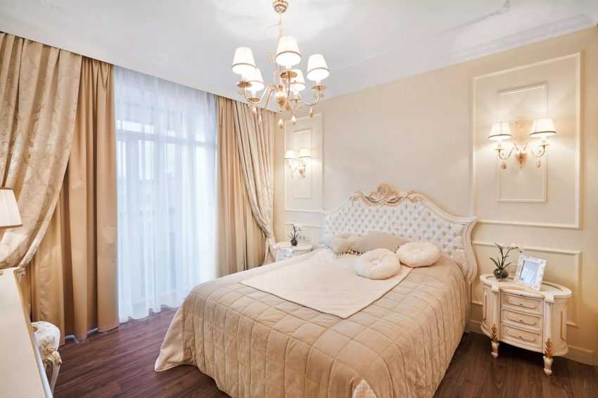 В бежевую спальню идеально впишется деревянная или металлическая кровать. При достаточном количестве площади выбирают конструкции, отличающиеся большими и массивными деталями.