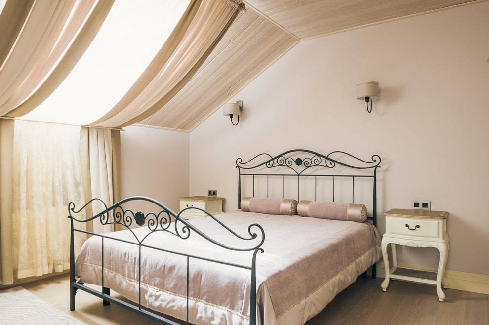 На фото дизайн мансардной спальни в бежевых тонах с металлической кованой кроватью.