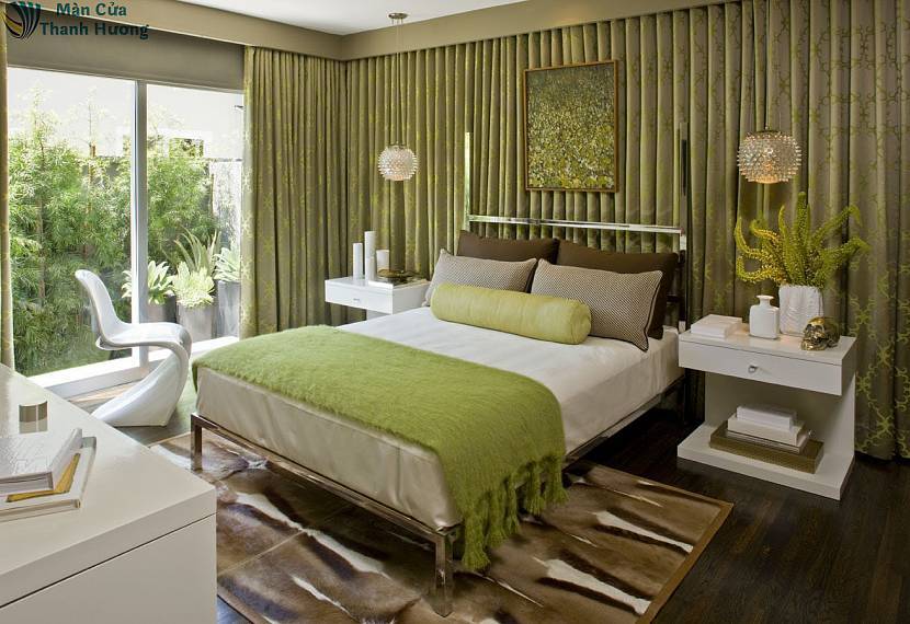 Интерьер спальни в зеленых тонах дополнит выбор штор, сочетающихся с общей обстановкой. Шторы дополняют комнату теплом и уютом. Хорошо подойдут шторы лазурного, лимонного или белого оттенка. В спальне в зеленых цветах, особенно светло-зеленых уместно будут смотреться темные портьеры. Для украшения можно использовать орнаменты и ламбрекены.