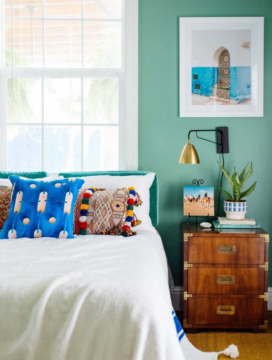 Сочный изумрудный цвет спальни подчеркивается белым потолком и шторамиИсточник design-homes.ru