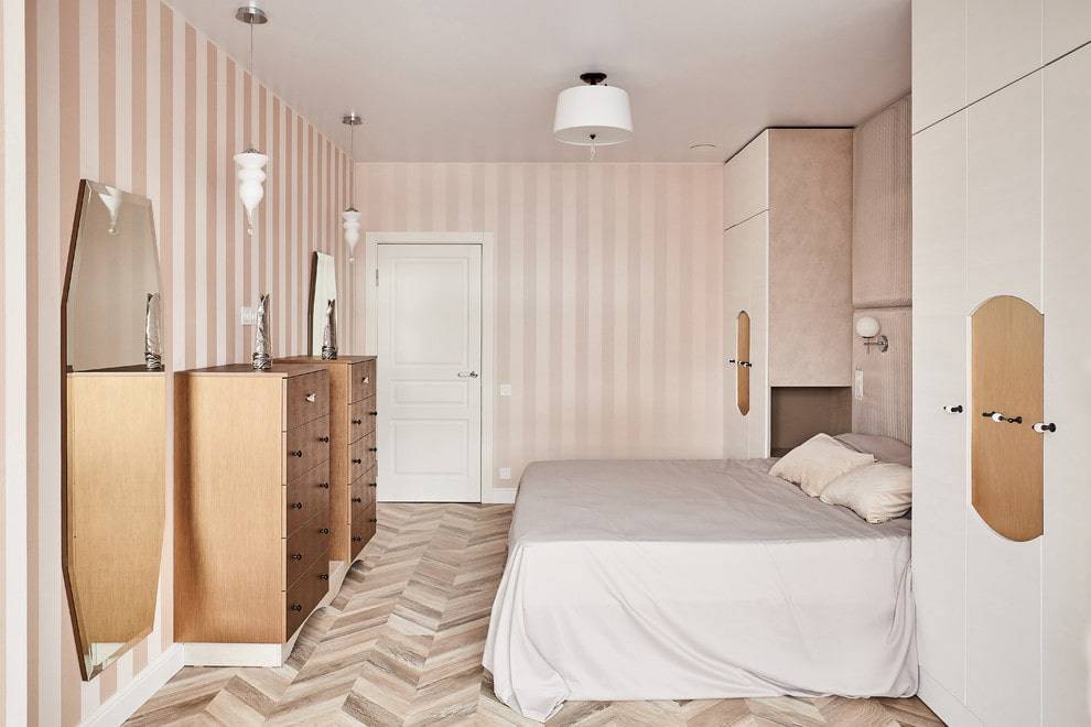 Для визуального расширения пространства прекрасно подойдут шкафы и прикроватные тумбочки белого цвета, которые разбавят бежевую палитру.