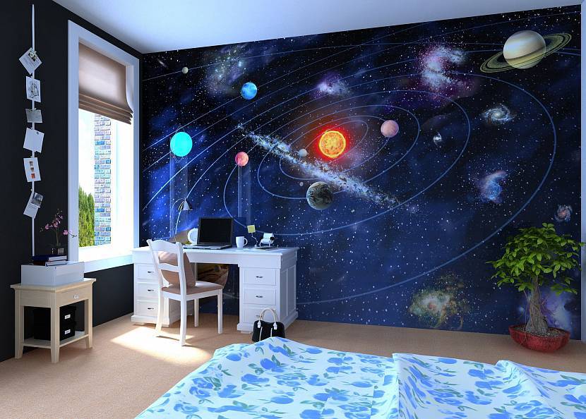 Некоторых детей привлекает тема космоса. В таком случае целесообразно создать ему соответствующую обстановку в комнате. Будьте внимательны, ведь для этого потребуются яркие и максимально естественные тона.