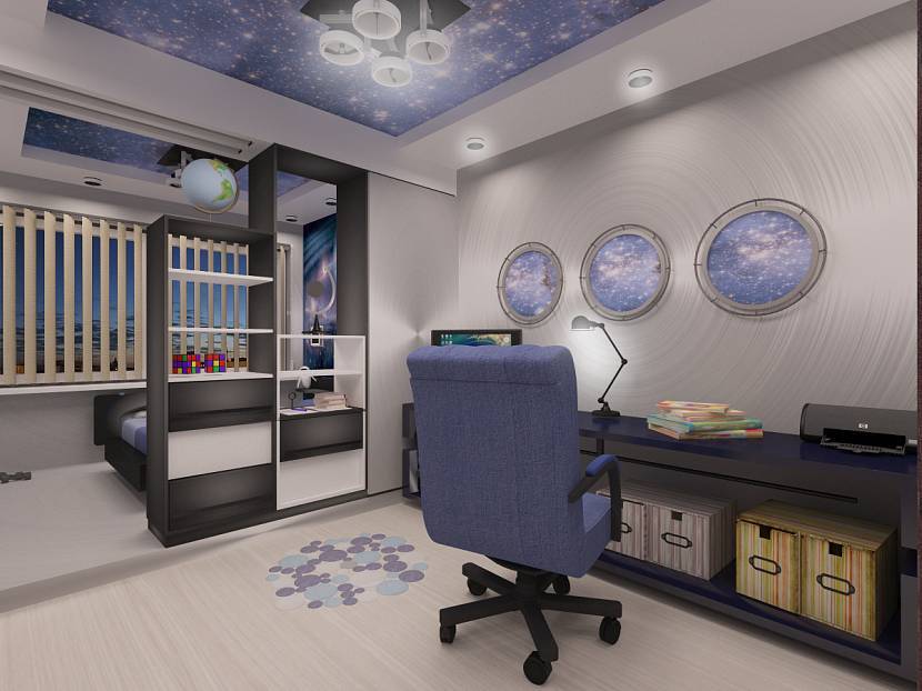 Многие предпочитают оформить комнату в стиле внутренней обстановки космического корабля. Это будет стоить недешево. В качестве бюджетного варианта достаточно лишь в комическом стиле оформить стены, сделать темный натяжной потолок со звездным небом. Фасад мебели может быть выполнен в темно-синем цвете. Часто даже заказывают шкафы с флуоресцентными фигурками: звездочками, месяцем, кометами.