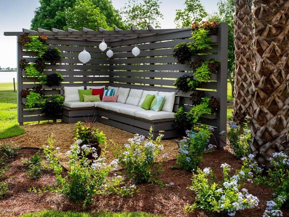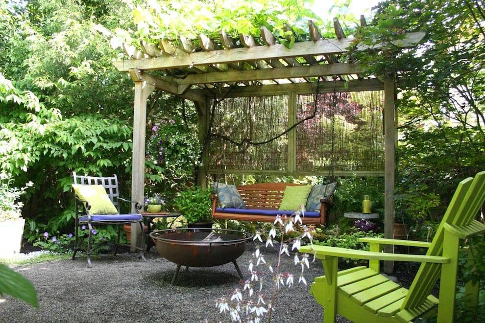 Выделение зоны отдыха кустами и шпалерой с вющимися растениями