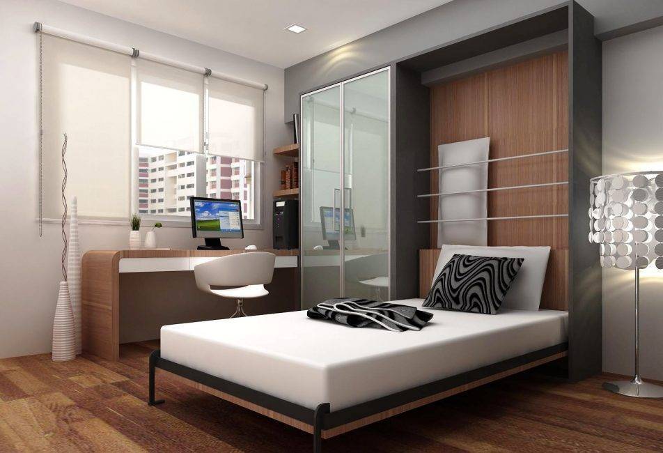 - спальня и рабочий кабинет – чаще всего используется это решение для совмещения. Для маленького пространства целесообразно будет приобрести кровать-трансформер. Изделие будет превращаться в шкаф в нужный момент, освобождая место в спальне для рабочей зоны. Здесь тоже можно использовать обыкновенную ширму для разграничения пространства;
