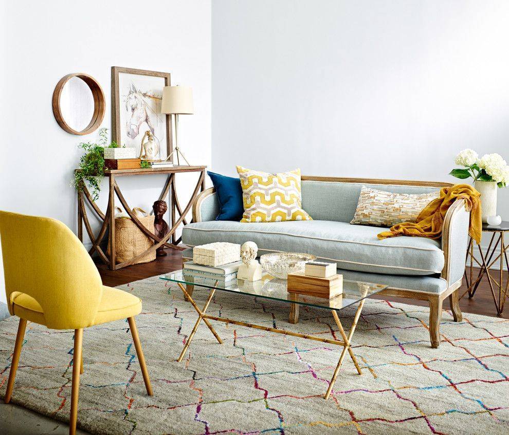 - напольное покрытие – области гостиной можно отделять коврами, ламинатом или плиткой;