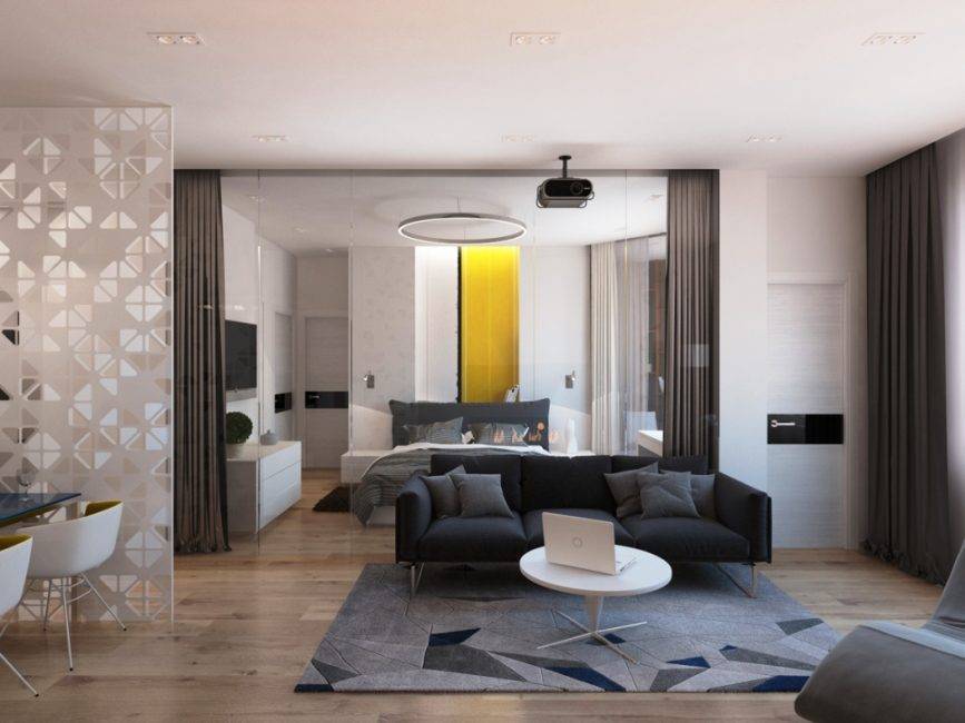 Кроме стен, помочь разделить пространство может оформление потолка, покрытия пола, организация системы освещения. Для зоны гостиной должен быть предусмотрен более яркий свет, чем для спального места.