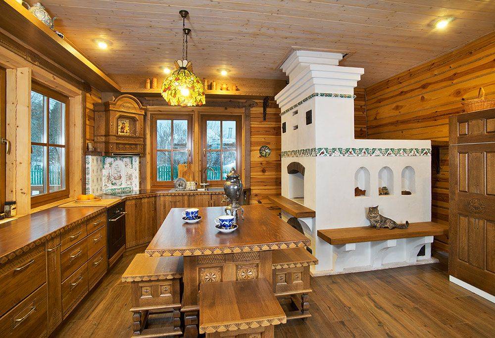 Русская печка стоит в деревянном доме в окружении мебели из массива дуба, выполненной в стиле Абрамцевских мастерских. Печка украшена двумя изразцовыми фризами с ручной росписью пигментами и глазурями по сырой эмали. За основу взяты русские расписные изразцы XVII–XVIII веков. Материалом послужили изразцовые печи, сохранившиеся в Суздале, в музее при Академии Штиглица в Санкт-Петербурге, реконструкция изразцовой печи в Новодевичьем монастыре. Панно за варочной панелью сделано в технике кистевой росписи по сырой эмали. Мотивом для его сюжета послужила голландская живопись XVII века.