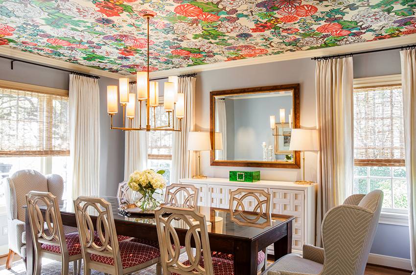 Интерьер гостиной с фотообоями на потолке, в нише или в виде модульной картины