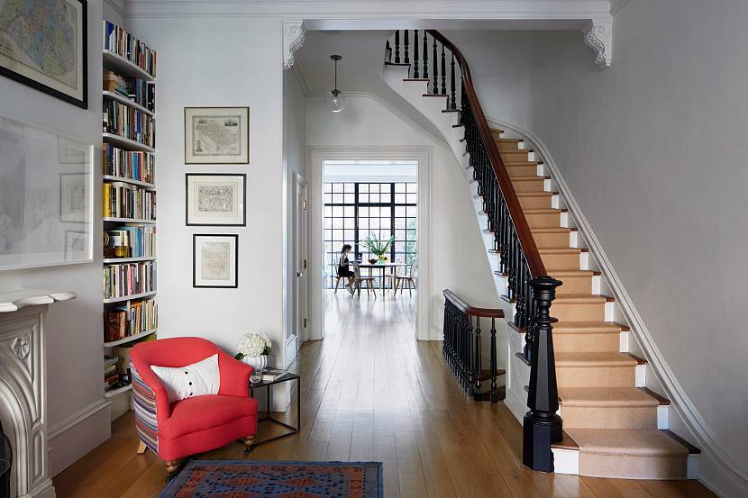 Лестница в спокойных тонах отлично сочетается с несколькими яркими элементами декора мебелиИсточник stairs-designs.blogspot.com/