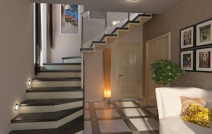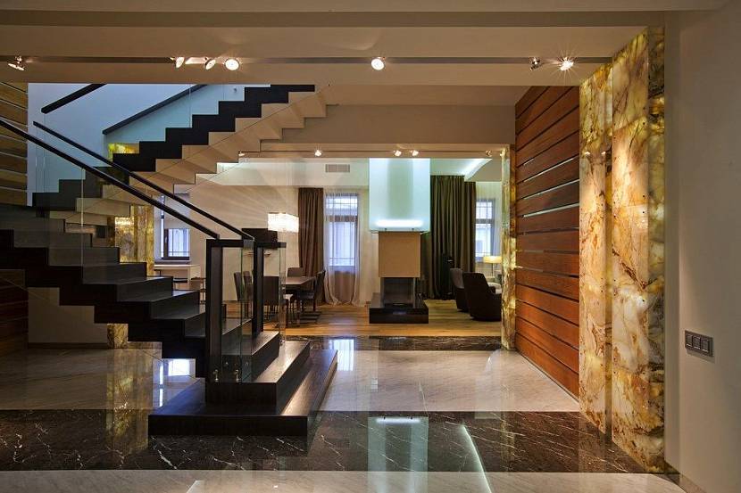 В этом случае, роль лестницы в интерьере второстепенная. В этом случае, гораздо важнее организовать пространство холла. Отделку выбирают такую, чтобы гармонировала со стилем и материалами оформления прихожей. Материалы для отделки лестничного марша могут быть любыми: от классического мрамора до цветного стекла в ударопрочном исполнении.