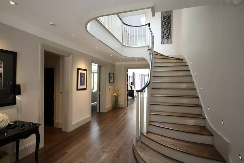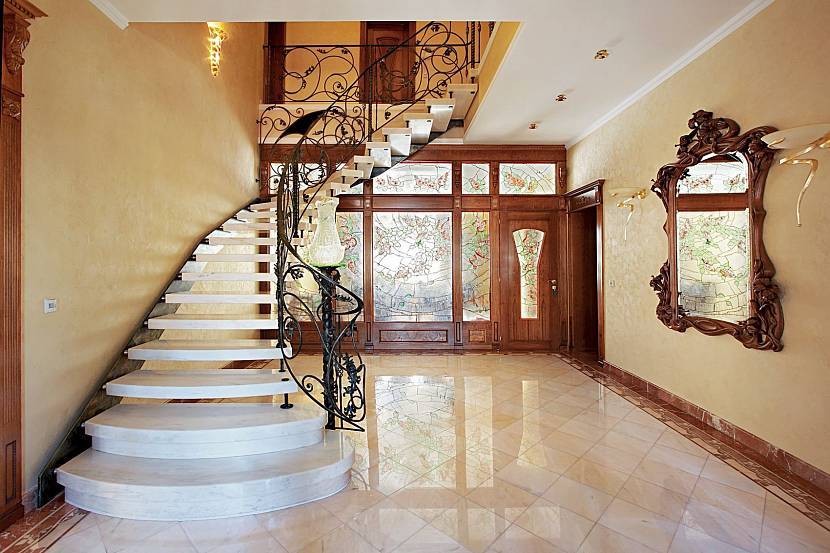 В этом случае акцентом холла является именно лестничная конструкция, поэтому требования к дизайну высокие. Для отделки выбирают самые красивые, престижные и добротные материалы. Например, мраморные ступени и перила из кованого металла создадут поистине дворцовое великолепие. Может быть и такой вариант: пол и ступени выполнены из одинаковой породы дерева. Если лестница узкая и лишена поворотов и промежуточного пролета, то выполняется из материалов, которые служат интерьерным акцентом.