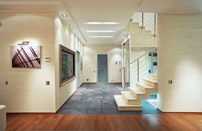 Ламинат на потолке в холле частного дома — стильно и со вкусом