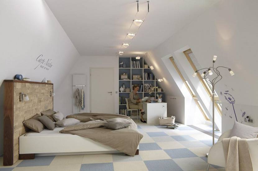 Имитация натуральных материалов отлично гармонирует с интерьером мансардной спальни.