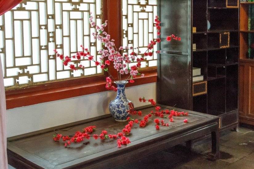В китайском интерьере большое внимание уделялось оформлению окон, которые являлись украшением комнаты. Окна были украшены частыми перегородками с замысловатыми деталями