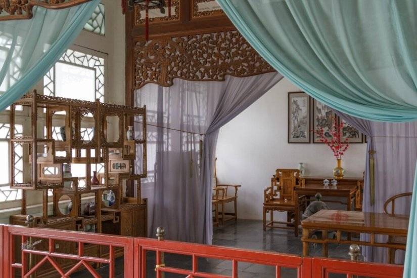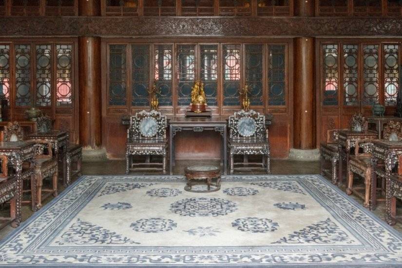 Парадные залы, где принимали посетителей, должны были, в первую очередь, показать богатство и знатность хозяина. Активно использовалась резьба по дереву, окна украшали тонкой изящной обрешеткой. Мебель здесь расставлена симметрично, используется парные предметы, что символизирует любовь, достаток и благополучие. Вокруг много других символов счастья.