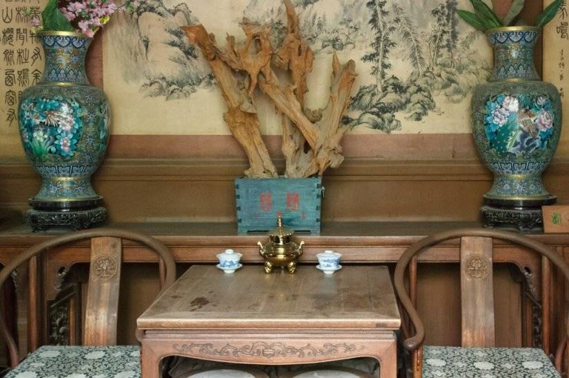 Стол с двумя стульями, вазы с цветами, картины, причудливой формы древесина. Парк Дагуань, Пекин