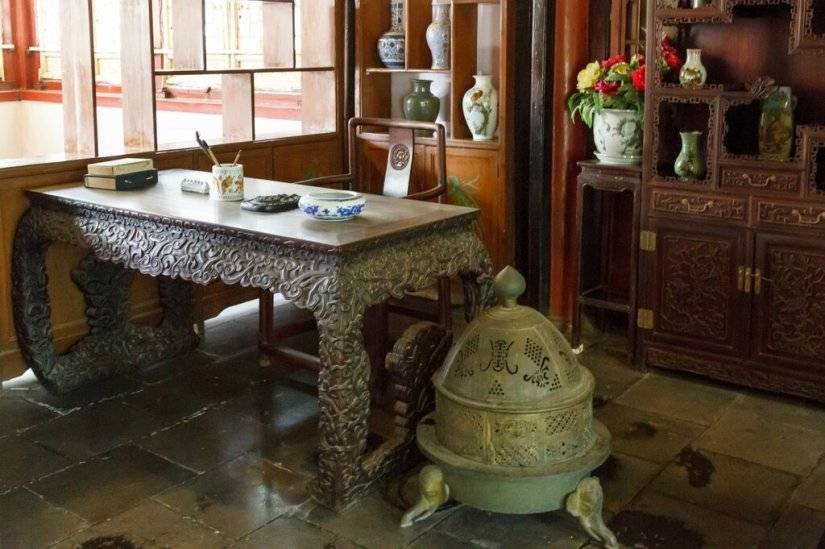 В кабинете обязательно присутствовал большой стол, на котором стояли «четыре сокровища кабинета» 文房四宝 вэнь фан сы бао — бумага, тушечница, тушь и кисти.